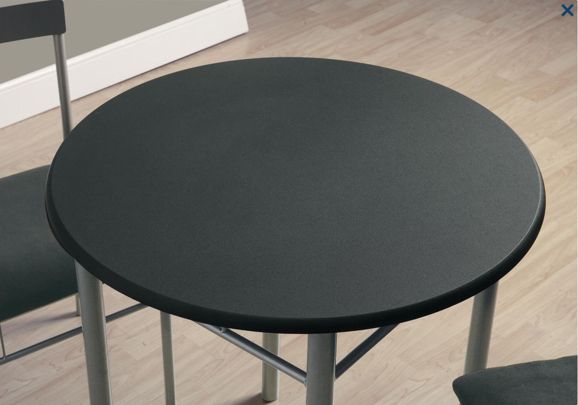 This intimate three piece bistro set offers a simple contemporary look for your dining area. The round table features a solid black pvc top, and sturdy charcoal grey steel metal tube legs. The armless side metal chairs feature a horizontal slat back with cushioned and upholstered seats in black microfiber for your comfort. The clean lines of this set creates a modern industrial look that you will love in your condo, apartment, or small house.