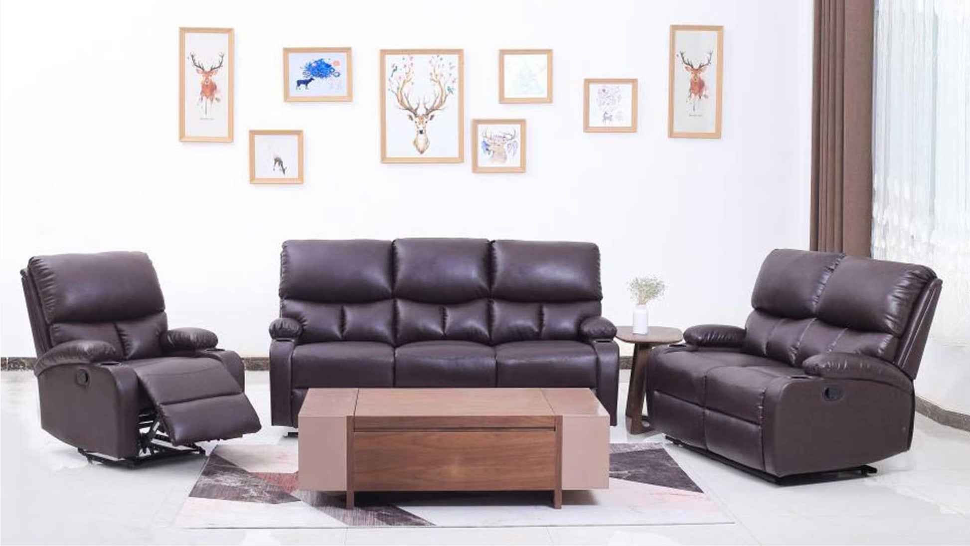 This chocolate brown bonded leather recliner set includes a Sofa, Love Seat and Chair. Recliner mechanism is manual