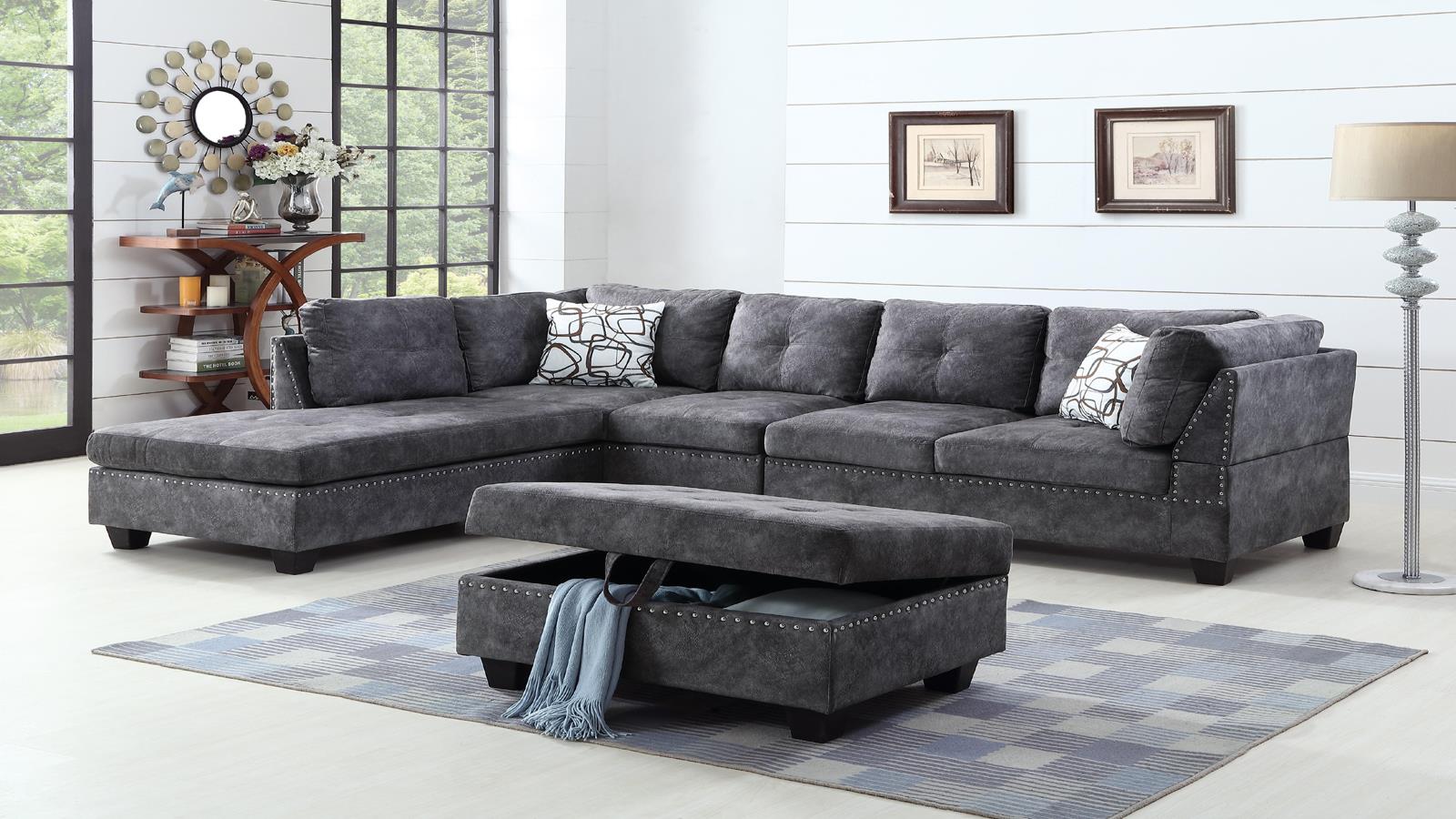 Grey fabric sectional set. Includes four pieces. Ottoman opens for storage