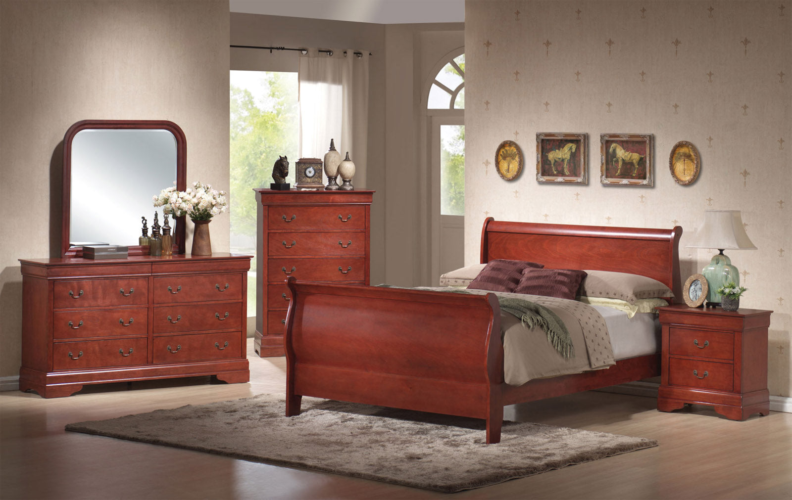 8PC Bedroom Set. Includes: Headboard, Footboard, Rails, Dresser, Mirror, 1 night stand and 5 drawer chest.